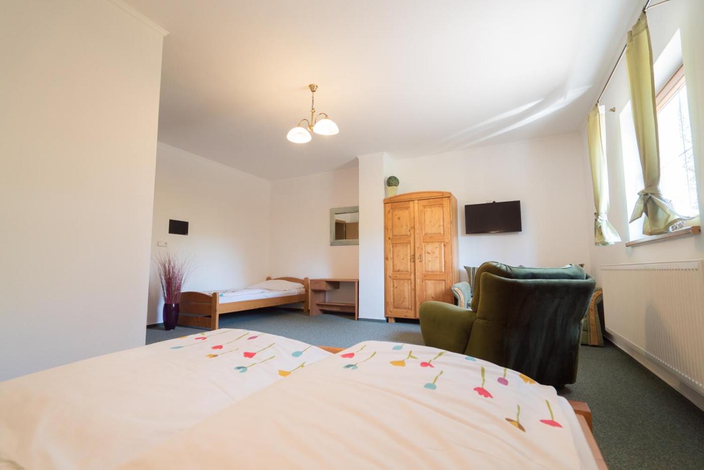 Double Room with Extra Bed. Offering free toiletries, this double room includes a private bathroom with a shower. The spacious double room offers a private entrance, a seating area, a wardrobe, a flat-screen TV with satellite channels, as well as garden views. The unit has 2 beds. ;