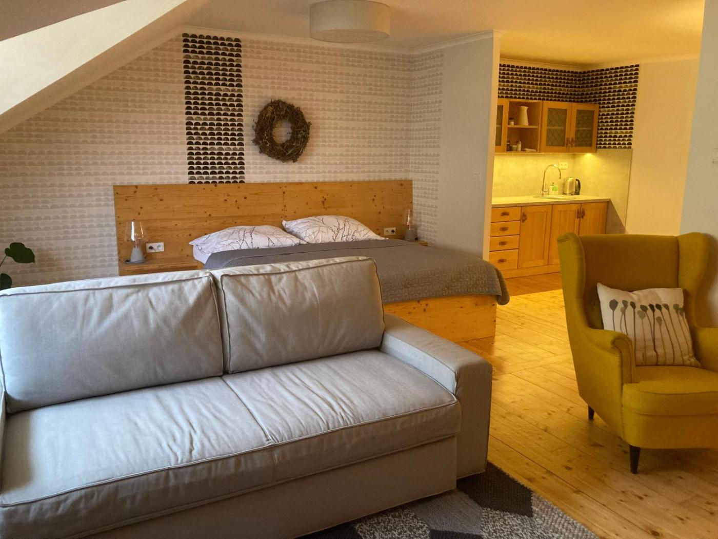 One-Bedroom Apartment. This apartment features 1 living room, 1 separate bedroom and 1 bathroom with a shower and a hairdryer. Guests can make meals in the kitchenette that features a stovetop, a refrigerator, kitchenware and a tea and coffee maker. The apartment features a sofa, parquet floors, heating, a flat-screen TV, as well as garden views. The unit has 2 beds. ;