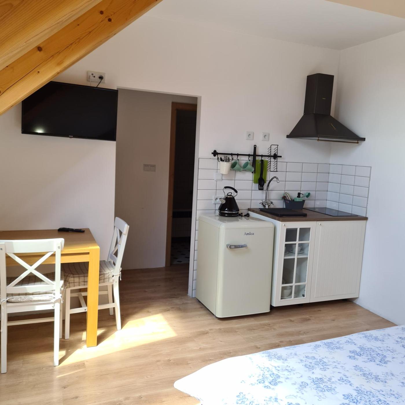 Double Room. Featuring free toiletries, this double room includes a private bathroom with a bath, a shower and a hairdryer. The well-equipped kitchenette has a stovetop, a refrigerator, kitchenware and a microwave. The double room features a tea and coffee maker, a wardrobe, heating, as well as a flat-screen TV. The unit has 1 bed. ;